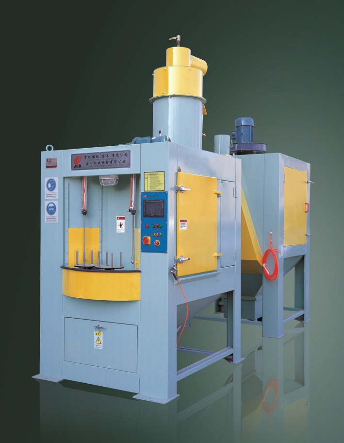 本設備是根據我公司針對轉動軸和處理要求而專門設計的轉盤式自動噴砂機,完全適合貴公司所提供的產品。根據貴公司對產品效率的要求,本機共大轉盤共設置4個區域(90度一個區域),每個區域設置2個工件裝夾工位。大轉盤每轉動90度區域一停,噴砂區域內共布置12支普壓高速噴砂槍,在噴砂區1個區域 2個噴砂加工位,各布置6支噴砂槍對工件需噴砂部位做擺動噴砂加工,噴槍可根據加工需要,隨意調整其噴射角度,其自動化程度較高。 該機由主機、旋風分離器、除塵箱、抽風管道、空氣壓縮系統(客戶自備)、電氣系統等組成。本機配置12支普壓高速噴砂槍,根據工件的大小可擺動噴砂,也可定點噴砂,靈活方便實用。